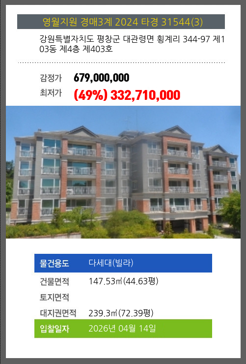 본건은 강원특별자치도 평창군 대관령면 횡계리 344-97 제103동 제4층 제403호