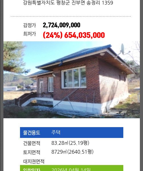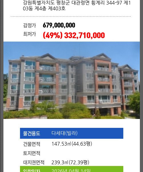 | 매각대상 | 공시가격1~2억 | 경매종류 | 임의경매 | 사건접수일 | 2024-09-06 |