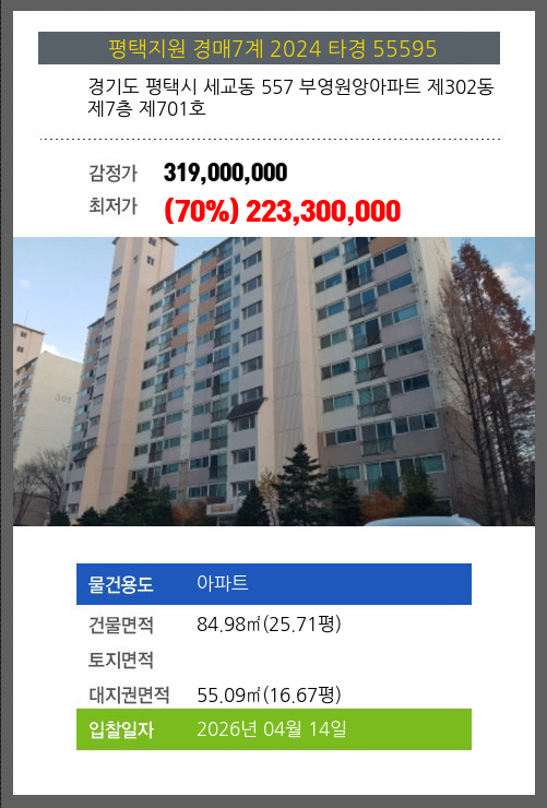 본건은 경기도 평택시 세교동 557 부영원앙아파트 제302동 제7층 제701호