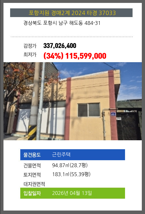 포항주택경매 포항시 남구 해도동 484-31 №2024 타경 37033