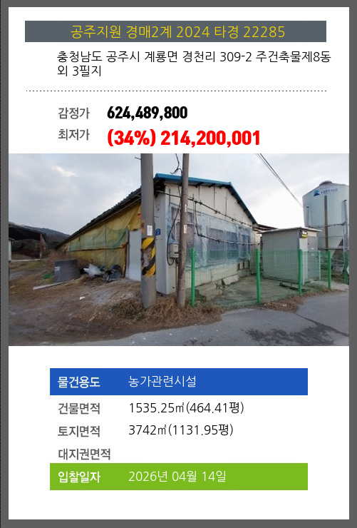 | 건물면적 | 1535.25㎡ (464.41평) | 채무자 | 농** | 최저가 | (34%) 214,200,001 |
