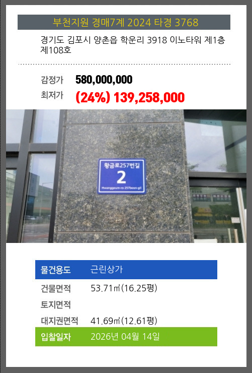 본건은 경기도 김포시 양촌읍 학운리 3918 이노타워 제1층 제108호