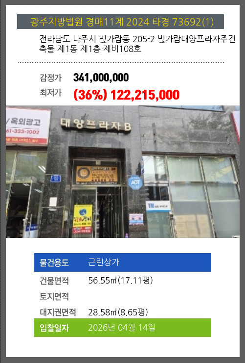 본건은 전라남도 나주시 빛가람동 205-2 빛가람대양프라자주건축물 제1동 제1층 제비108호
