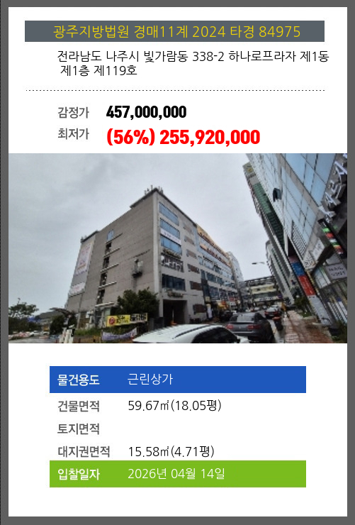본건은 전라남도 나주시 빛가람동 338-2 하나로프라자 제1동 제1층 제119호