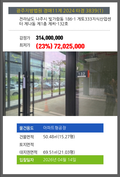 나주아파트형공장경매 나주시 빛가람동 186-1 게토333지식산업센터 제나동 제1층 제씨-132호 №2024 타경 3839(1)