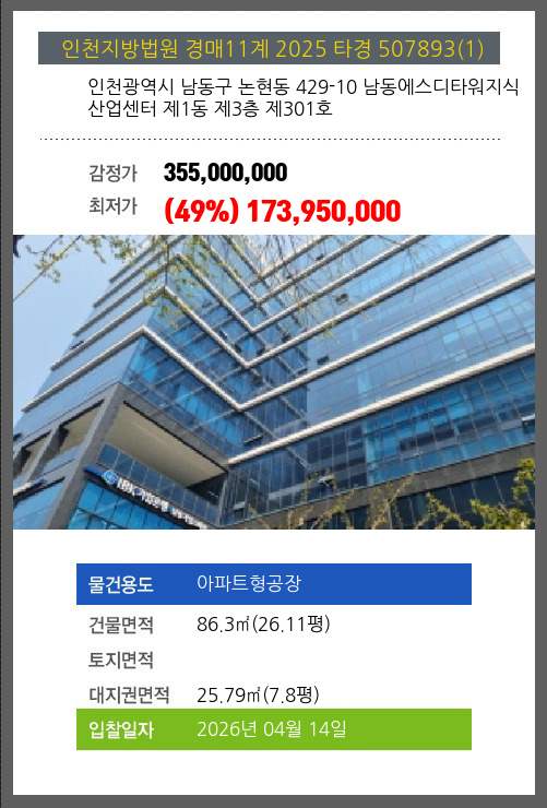 남동아파트형공장경매 남동구 논현동 429-10 남동에스디타워지식산업센터 제1동 제3층 제301호 №2025 타경 507893(1)