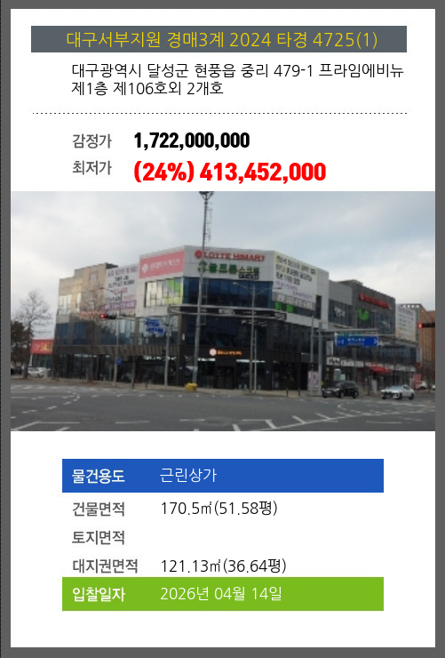 본건은 대구광역시 달성군 현풍읍 중리 479-1 프라임에비뉴 제1층 제106호외 2개호