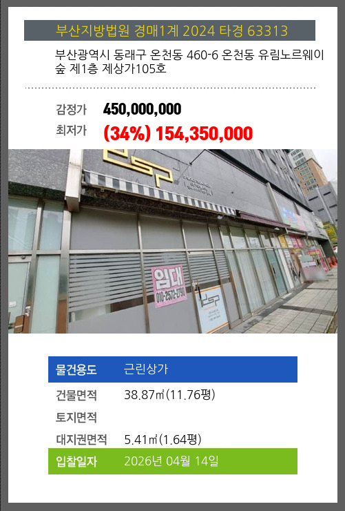 본건은 부산광역시 동래구 온천동 460-6 온천동 유림노르웨이숲 제1층 제상가105호