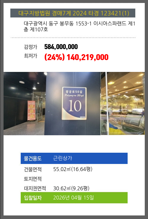 본건은 대구광역시 동구 봉무동 1553-1 이시아스파랜드 제1층 제107호