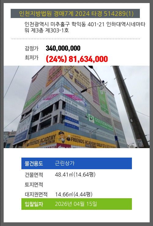 본건은 인천광역시 미추홀구 학익동 401-21 인하대역시네마타워 제3층 제303-1호