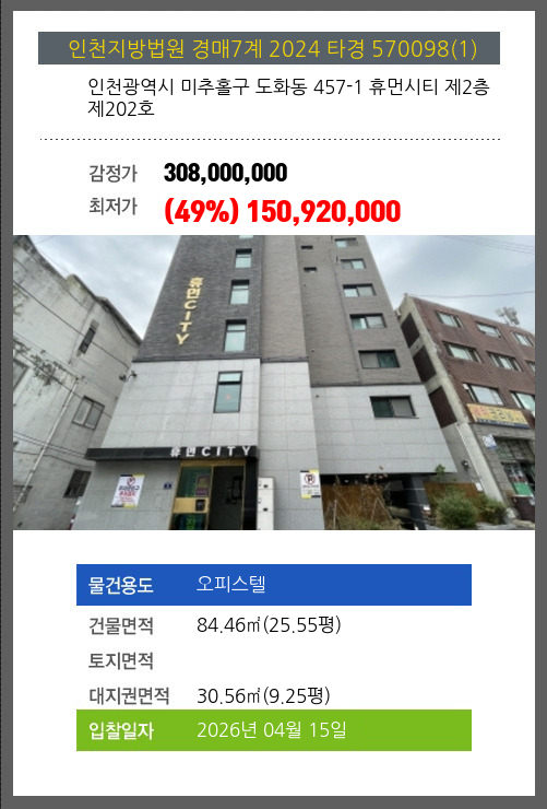 본건은 인천광역시 미추홀구 도화동 457-1 휴먼시티 제2층 제202호