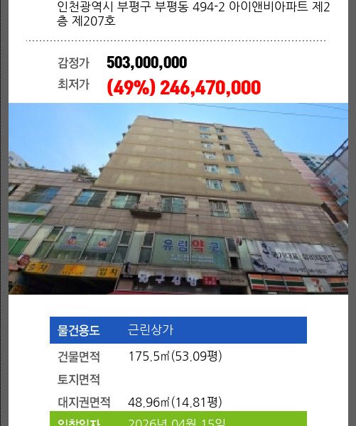 | 건물면적 | 84.46㎡ (25.55평) | 채무자 | ㈜** | 최저가 | (49%) 150,920,000 |