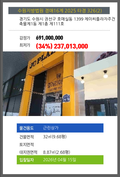 수원상가경매 수원시 권선구 호매실동 1399 제이씨플라자주건축물제1동 제1층 제111호 №2025 타경 326(2)