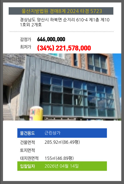 양산상가경매 양산시 하북면 순지리 610-4 제1층 제101호외 2개호 №2024 타경 5723
