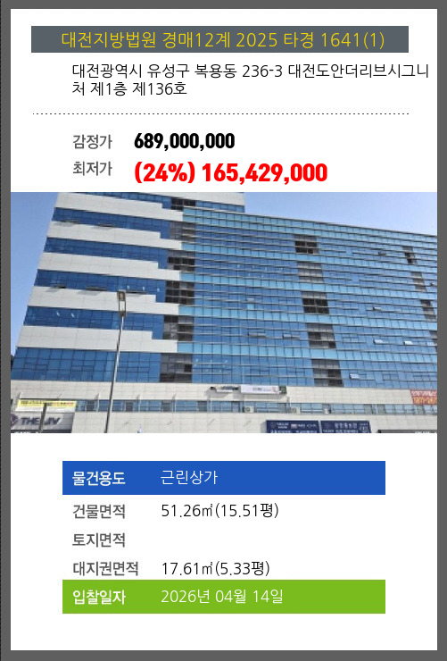 본건은 대전광역시 유성구 복용동 236-3 대전도안더리브시그니처 제1층 제136호
