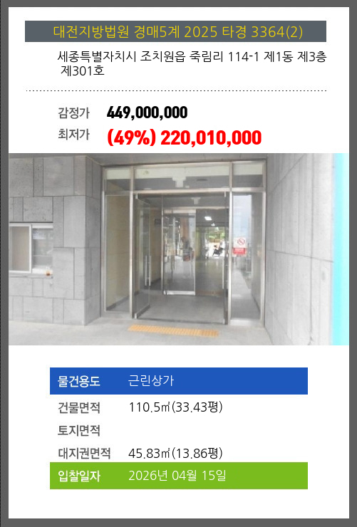 본건은 세종특별자치시 조치원읍 죽림리 114-1 제1동 제3층 제301호