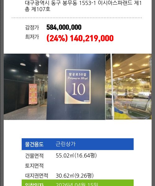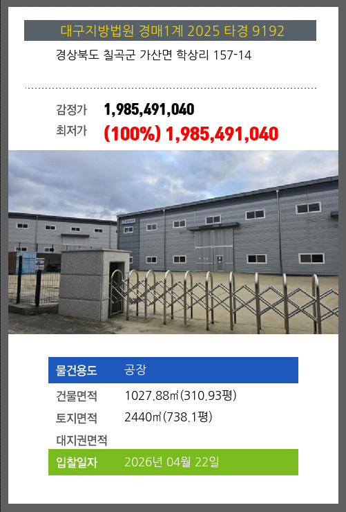 | 용도 | 공장 | 채권자 | 중** | 감정가 | 1,985,491,040 |