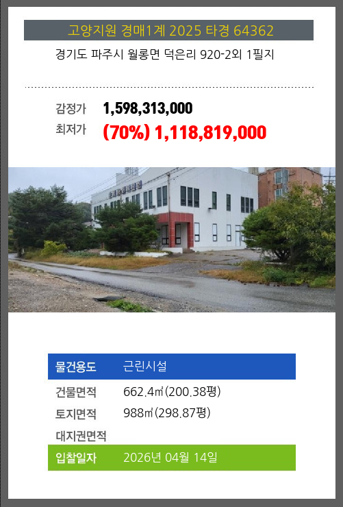 | 소재지 | [지번] 경기도 파주시 월롱면 덕은리 920-2외 1필지 [도로명 주소] 경기도 파주시 월롱면 엘지로386번길 67외 1필지 |