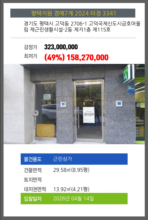 평택상가경매 평택시 고덕동 2706-1 고덕국제신도시금호어울림 제근린생활시설-2동 제지1층 제115호 №2024 타경 3341