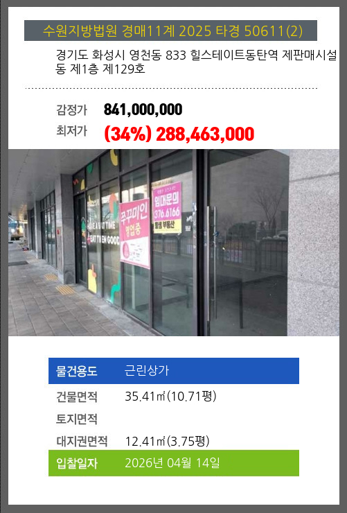 본건은 경기도 화성시 영천동 833 힐스테이트동탄역 제판매시설동 제1층 제129호