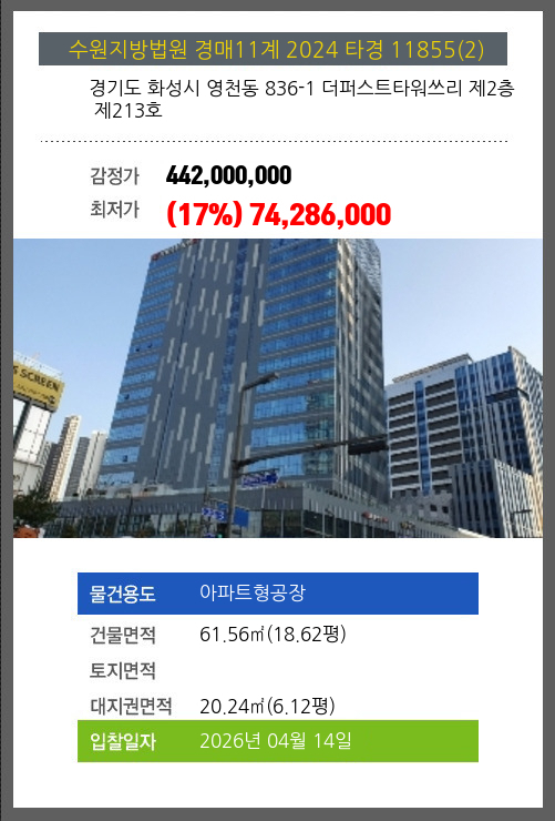 본건은 경기도 화성시 영천동 836-1 더퍼스트타워쓰리 제2층 제213호