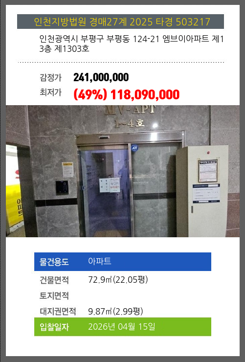 본건은 인천광역시 부평구 부평동 124-21 엠브이아파트 제13층 제1303호
