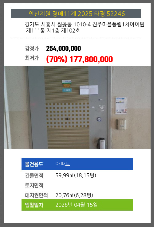 | 건물면적 | 59.99㎡ (18.15평) | 채무자 | 전** | 최저가 | (70%) 177,800,000 |