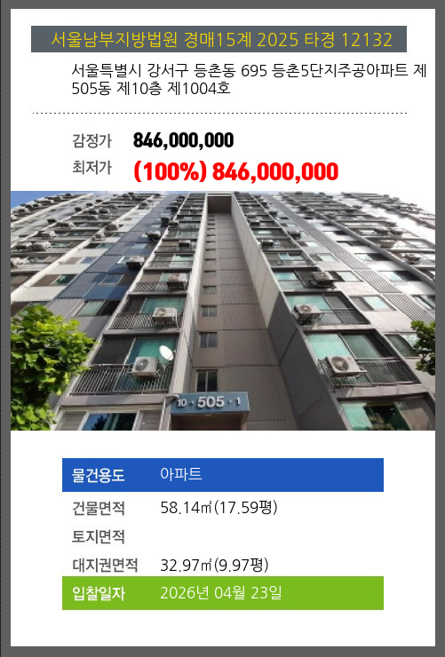 본건은 서울특별시 강서구 등촌동 695 등촌5단지주공아파트 제505동 제10층 제1004호