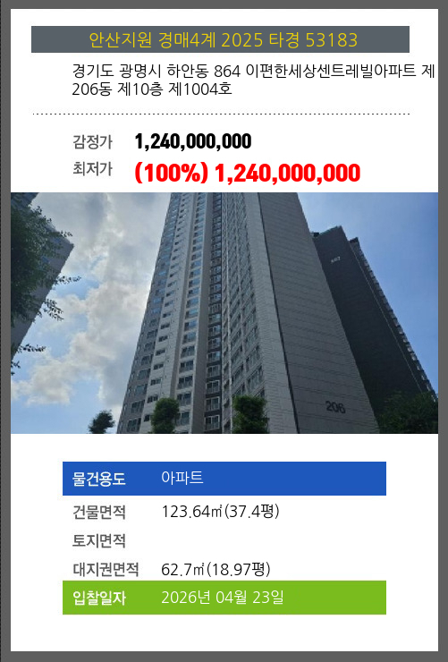 광명아파트경매 광명시 하안동 864 이편한세상센트레빌아파트 제206동 제10층 제1004호 №2025 타경 53183