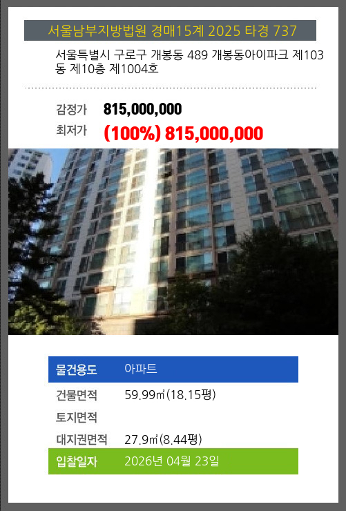 본건은 서울특별시 구로구 개봉동 489 개봉동아이파크 제103동 제10층 제1004호