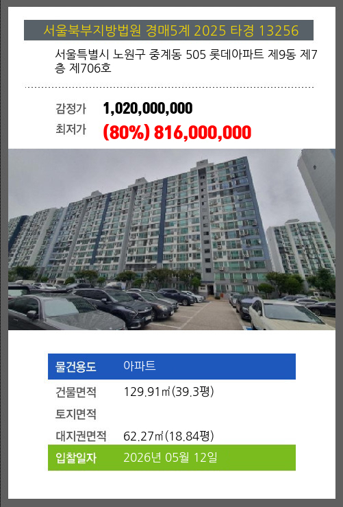 | 건물면적 | 129.91㎡ (39.3평) | 채무자 | 최** | 최저가 | (80%) 816,000,000 |