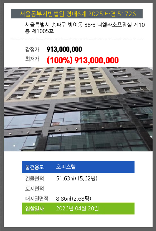 | 용도 | 오피스텔 | 채권자 | 이** | 감정가 | 913,000,000 |