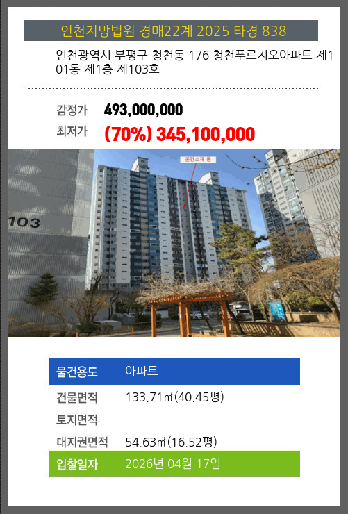 부평아파트경매 부평구 청천동 176 청천푸르지오아파트 제101동 제1층 제103호 №2025 타경 838