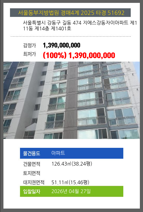 강동아파트경매 강동구 길동 474 지에스강동자이아파트 제111동 제14층 제1401호 №2025 타경 51692