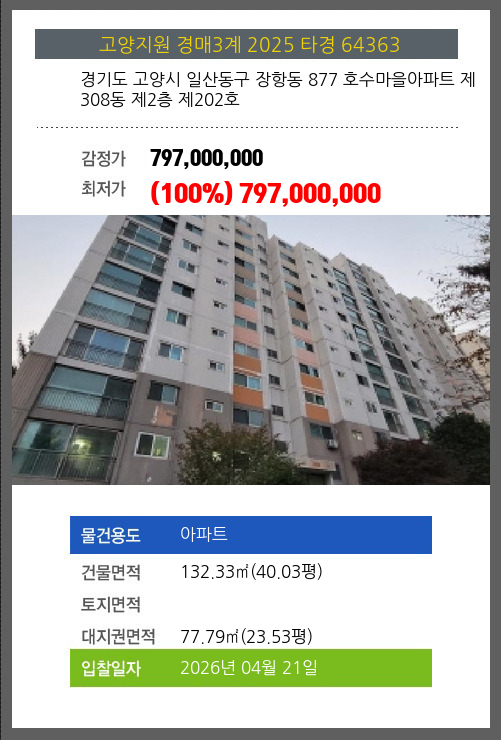 소재지 [지번] 경기도 고양시 일산동구 장항동 877 호수마을아파트 제308동 제2층 제202호