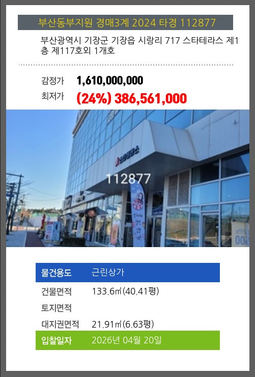 본건은 부산광역시 기장군 기장읍 시랑리 717 스타테라스 제1층 제117호외 1개호