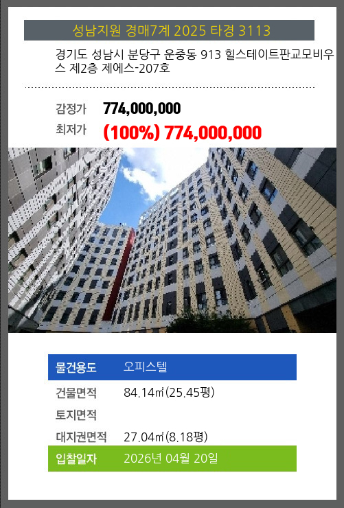 | 건물면적 | 84.14㎡ (25.45평) | 채무자 | 유** | 최저가 | (100%) 774,000,000 |