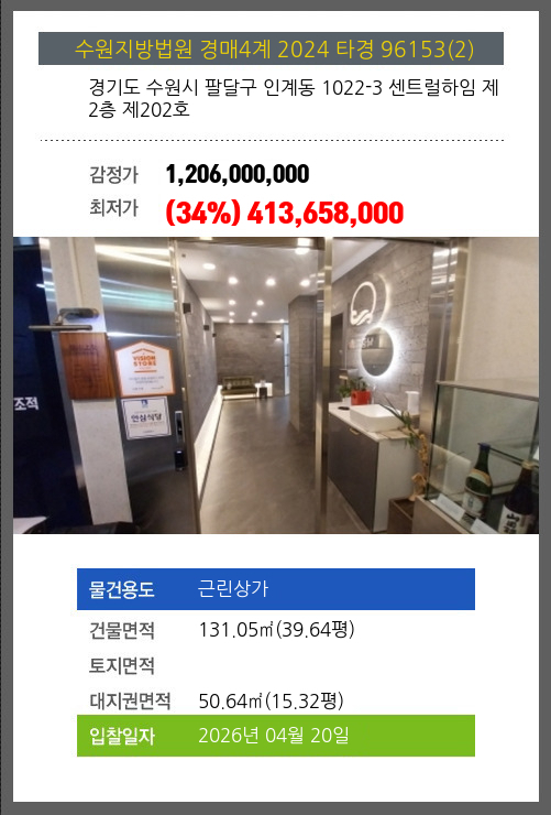 | 소재지 | [지번] 경기도 수원시 팔달구 인계동 1022-3 센트럴하임 제2층 제202호 [도로명 주소] 경기도 수원시 팔달구 인계로108번길 18 센트럴하임 제2층 제202호 |