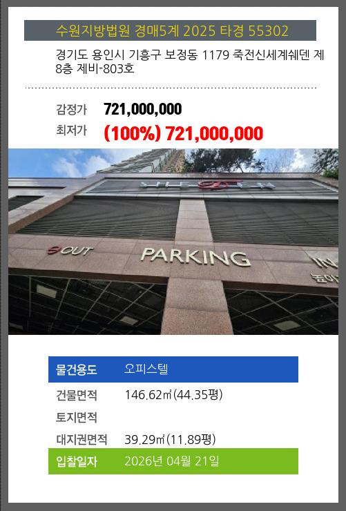 본건은 경기도 용인시 기흥구 보정동 1179 죽전신세계쉐덴 제8층 제비-803호
