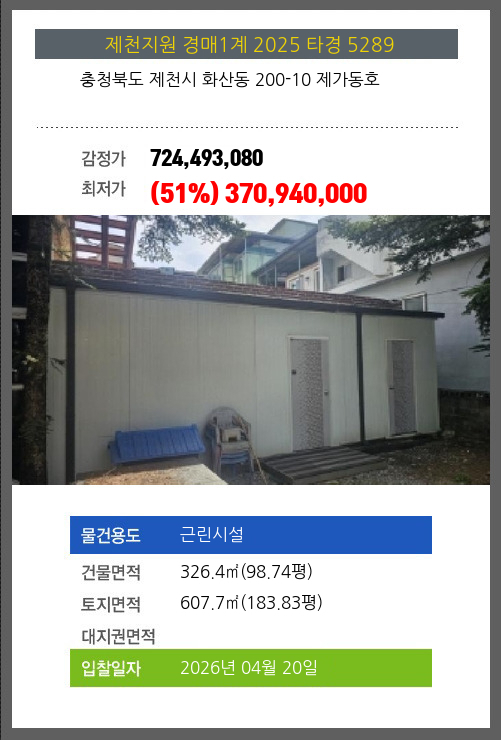 | 소재지 | [지번] 충청북도 제천시 화산동 200-10 제가동호 [도로명 주소] 충청북도 제천시 의림대로8길 4 제가동호 |