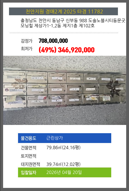 천안상가경매 천안시 동남구 신부동 988 도솔노블시티동문굿모닝힐 제상가1-1,2동 제지1층 제102호 №2025 타경 11782