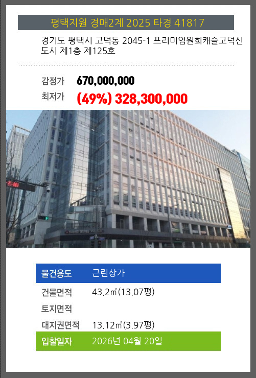본건은 경기도 평택시 고덕동 2045-1 프리미엄원희캐슬고덕신도시 제1층 제125호