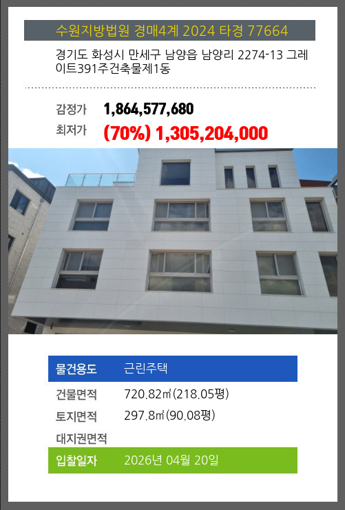 | 용도 | 근린주택 | 채권자 | 김**외1명 | 감정가 | 1,864,577,680 |