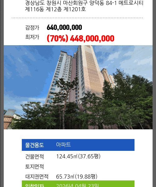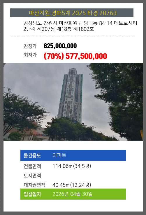 창원아파트경매 창원시 마산회원구 양덕동 84-14 메트로시티2단지 제207동 제18층 제1802호 №2025 타경 20763
