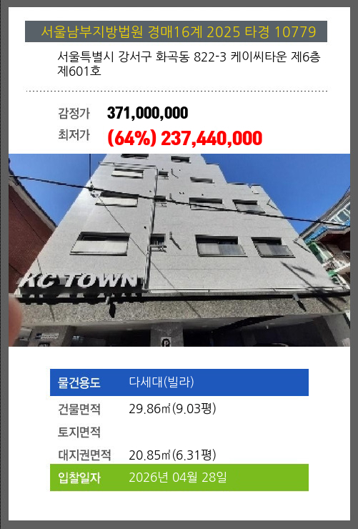 본건은 서울특별시 강서구 화곡동 822-3 케이씨타운 제6층 제601호