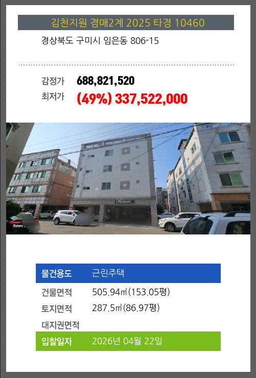 | 용도 | 근린주택 | 채권자 | 아** | 감정가 | 688,821,520 |