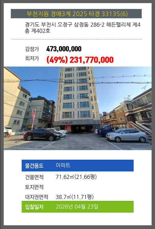 부천아파트경매 부천시 오정구 삼정동 286-2 해든팰리체 제4층 제402호 №2025 타경 33135(6)