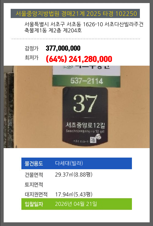 본건은 서울특별시 서초구 서초동 1626-10 서초다산빌라주건축물제1동 제2층 제204호