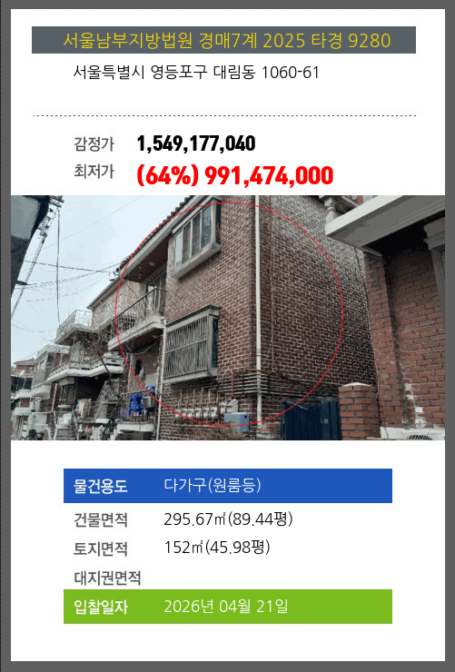 | 용도 | 다가구(원룸등) | 채권자 | 대** | 감정가 | 1,549,177,040 |