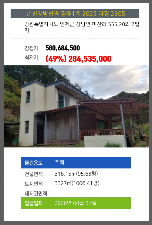 | 소재지 | [지번] 강원특별자치도 인제군 상남면 미산리 555-20외 2필지 [도로명 주소] 강원도 인제군 상남면 솔개길 29-45외 2필지 |